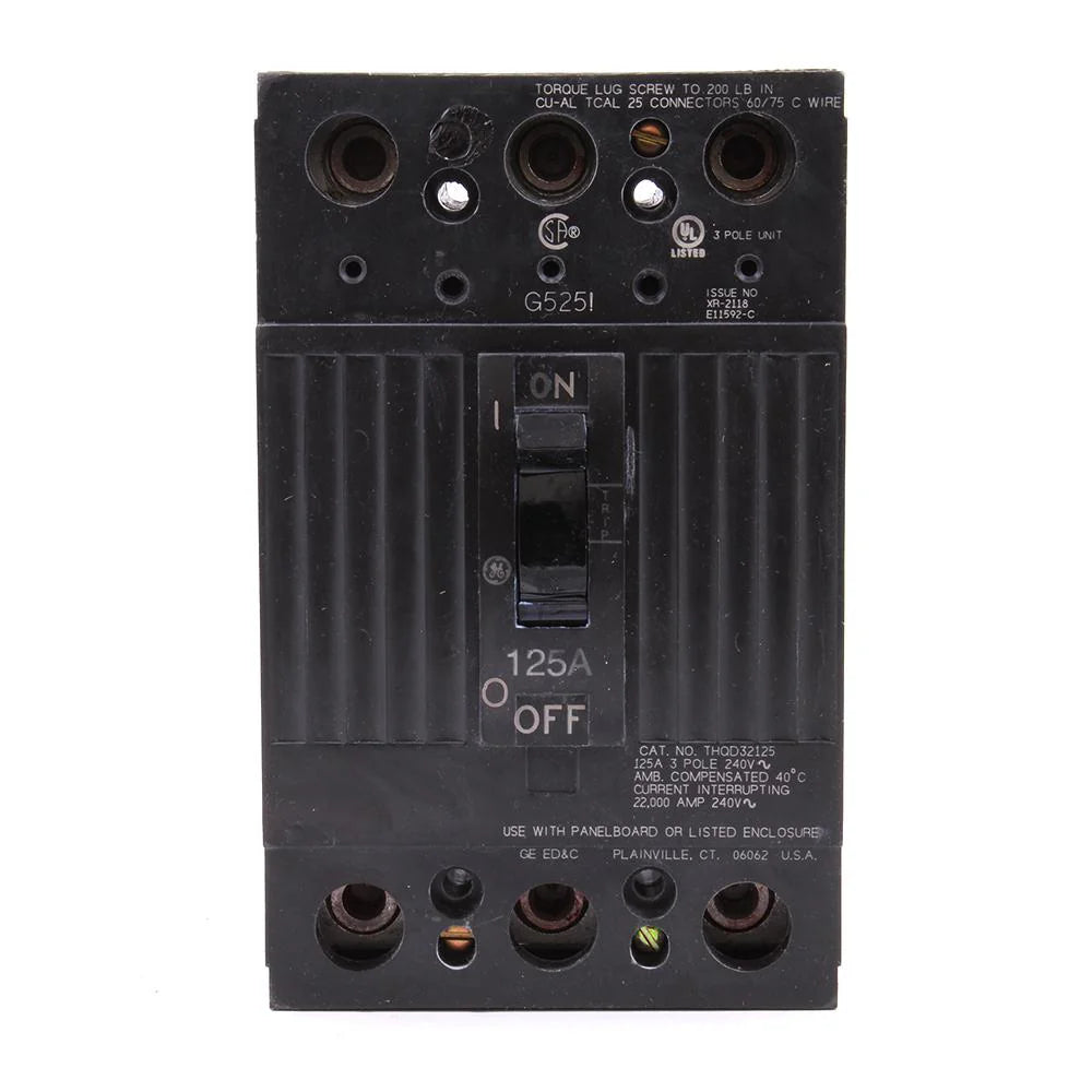General Electric Q-Line, Type THQD, 3P, 3PH, 125A, 240V, 22kA@240V, complete with non-interchangeable trip unit and line & load side lug terminals, high interrupting capacity, 40 degree C, feed-thru, thermal magnetic molded case circuit breakers