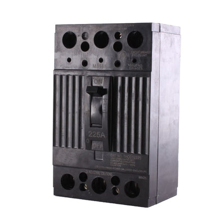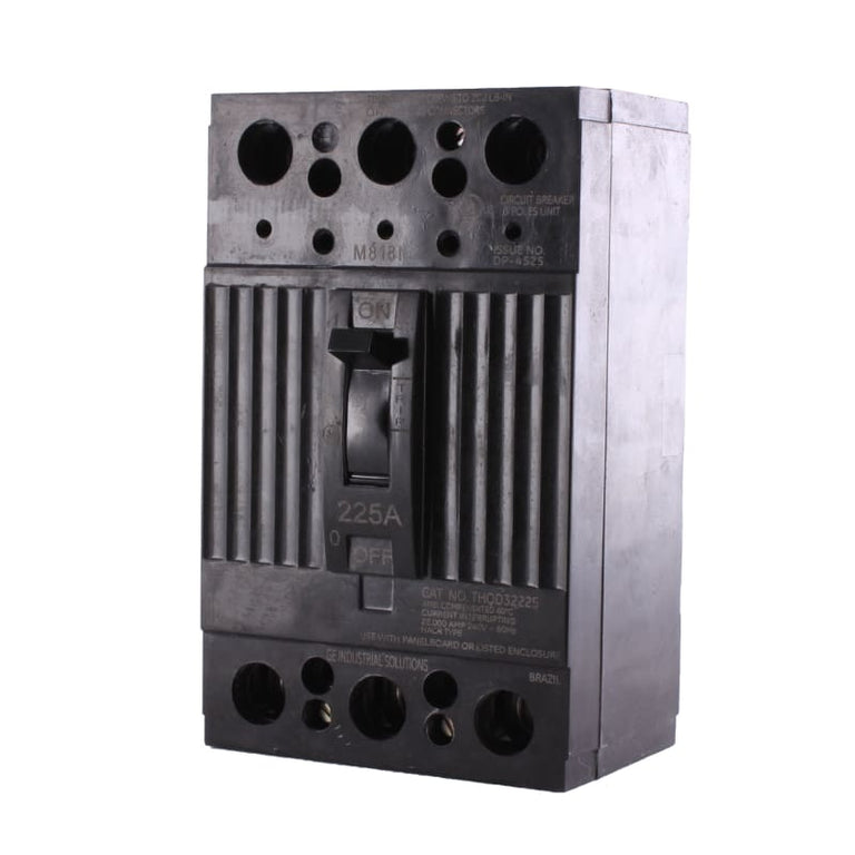 General Electric Q-Line, Type THQD, 3P, 3PH, 225A, 240V, 22kA@240V, complete with non-interchangeable trip unit and line & load side lug terminals, high interrupting capacity, 40 degree C, feed-thru, thermal magnetic molded case circuit breakers