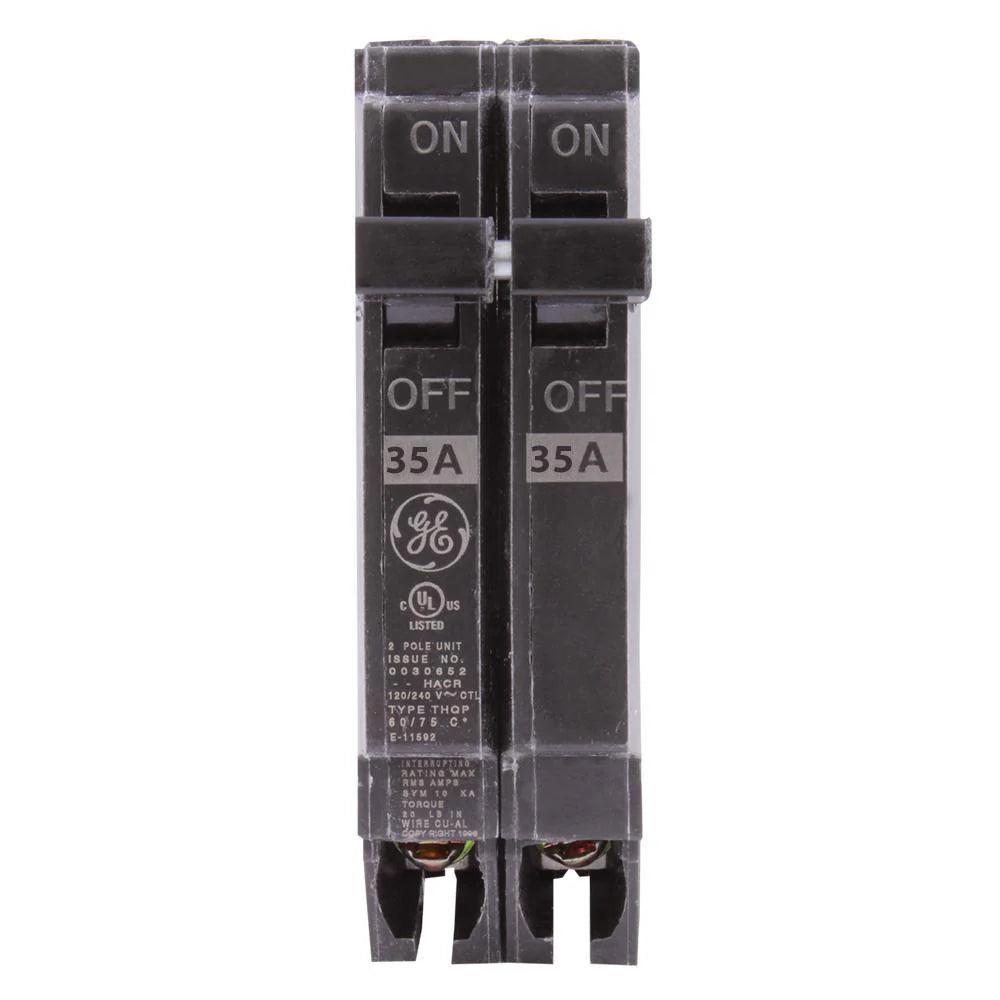 General Electric, type THQP, 2P, 1PH, 35A, 120V, 10kA@120V, UL listed, plug-in, complete with internal common trip, LI - Long-Time and Instantaneous trip functions and load side lug terminal, thermal magnetic