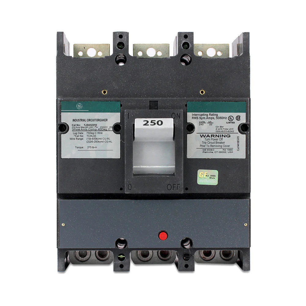 General Electric Q-Line, Type TJD, 3P, 3PH, 250A, 240V, 22kA@240V, complete with non-interchangeable trip unit and line & load side lug terminals, standard interrupting capacity, 40Ã"šÂ°C, feed-thru